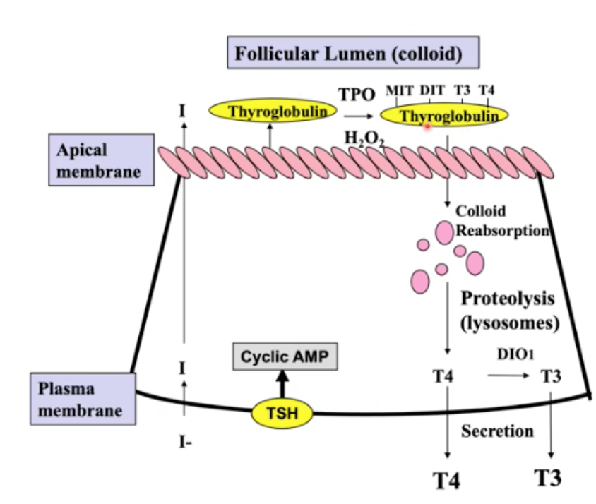 -Enzymes breakdown the colloid and the hormone is then secreted out into the capillaries