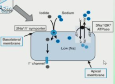 the “I-trap” or 2Na+/I- cotransporter actively transports iodine from the basolateral side of the follicular cells against both electrical and chemical gradients and a 3Na/2K+ ATPase on the basolateral side maintains the gradient