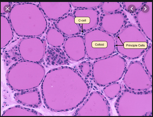 Secretes calcitonin which regulates calcium levels by decreasing it when too high. They also have a pale cytoplasm.