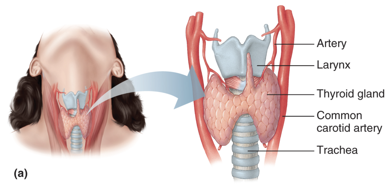 ventral surface of trachea with two lobes which are connected by bridge of tissue. Very vascularized and one of the highest rates of blood per gram of tissue and secretes two types of hormones (T3 and T4). also secretes calcitonin. The parts that secrete T3 and T4 are different from those that secrete calcitonin and work in different ways.