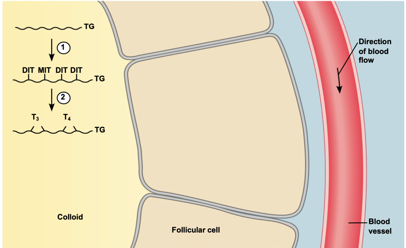 DIT and T4 make up the bulk each comprising about ⅓ (total ⅔) of iodinated compound within colloid, MIT about ¼ and T3 less than 10%