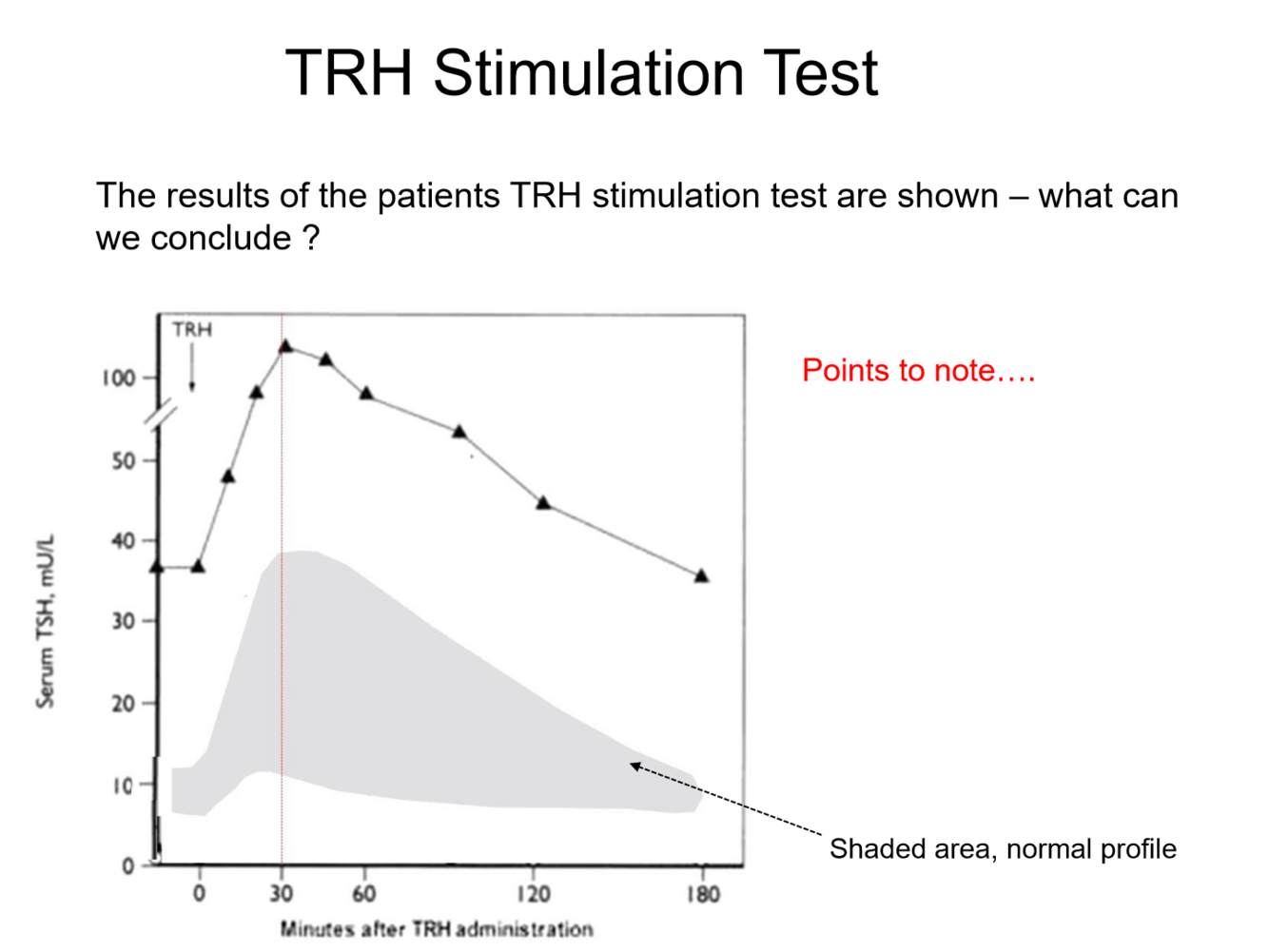 the women (who has classic hypothyroidism) was put through a TRH stimulation test - what can we conclude? also what does the red line mean?