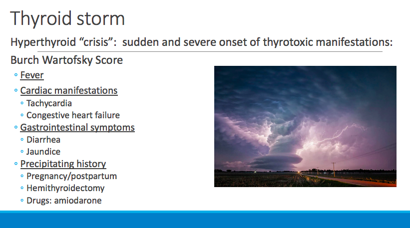 How do patients with thyroid storm typically present; if left untreated what is a common cause of death?