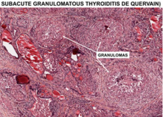 What histological findings are associated with Subacute thyroiditis (de Quervain)?