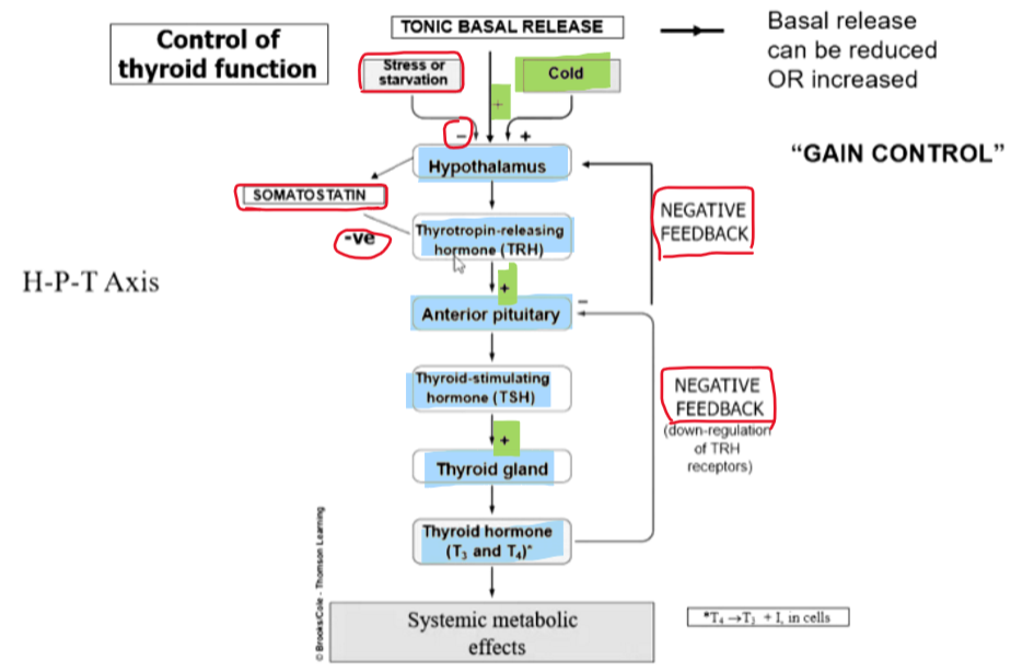 Hypothalamus → Thyrotropin releasing hormone (TRH) → AP → TSH → Thyroid gland → T3, T4