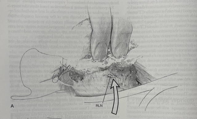 2) Identification of the recurrent laryngeal nerve in virgin territory if possible