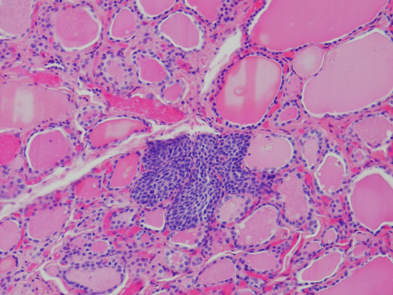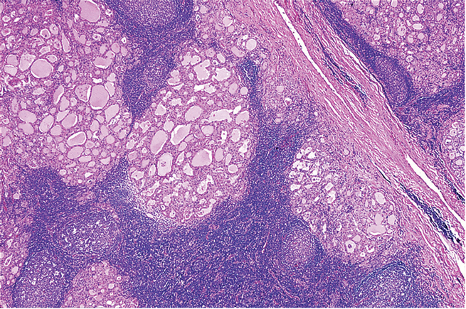 La thyroïdite d’Hashimoto présente un important infiltrat inflammatoire.