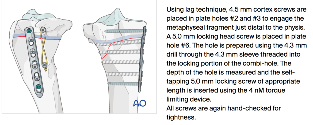 Implant (LCP pref) placed MEDIALLY on the proximal tibia