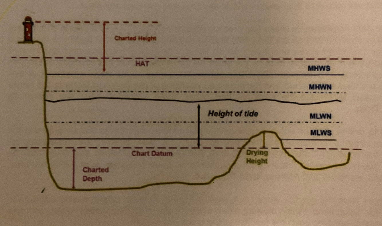 With the aid of a sketch, explain Chart Datum, LAT, MHWS, MHWN, MLWN, MLWS, HOT,