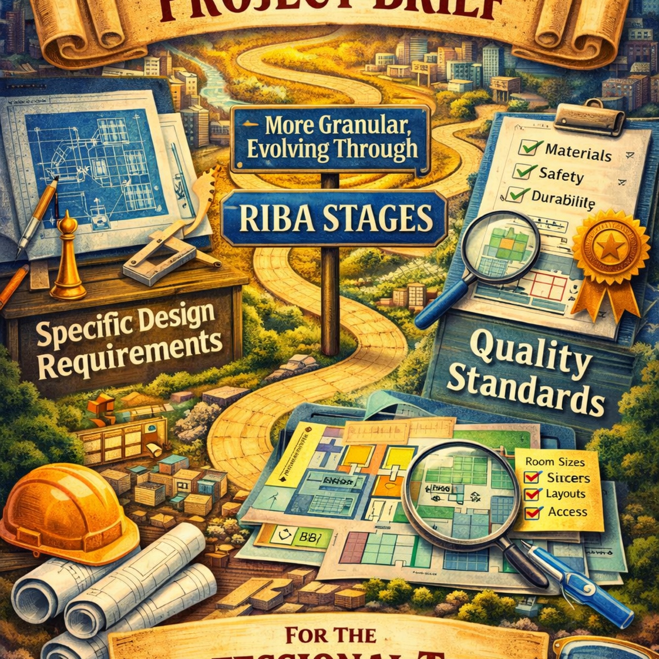A Project Brief is more granular, evolving through RIBA Stages to set out specific design requirements, spatial needs, and quality standards for the professional team.