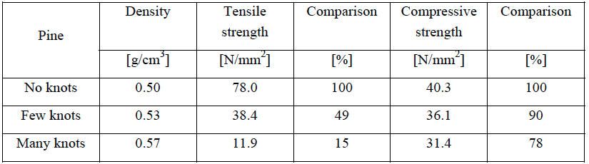 Influence of knots on the strength of pine timber loaded parallel to the grain.