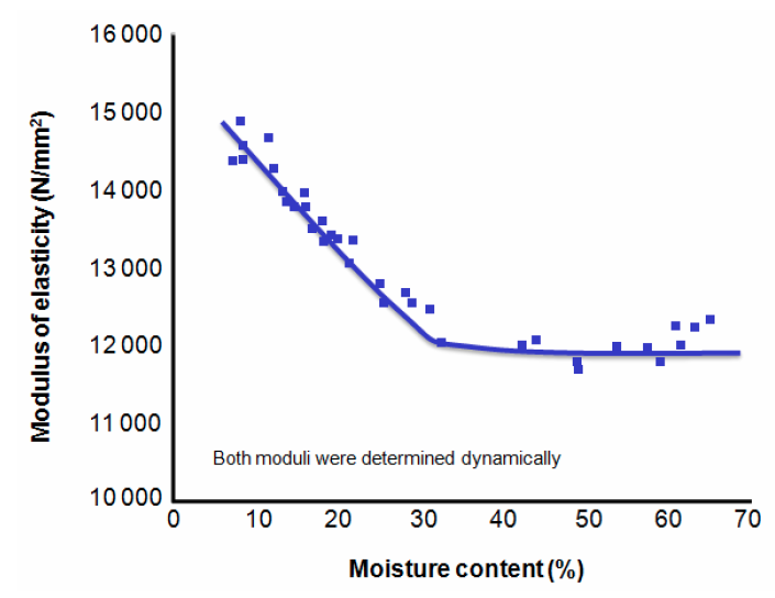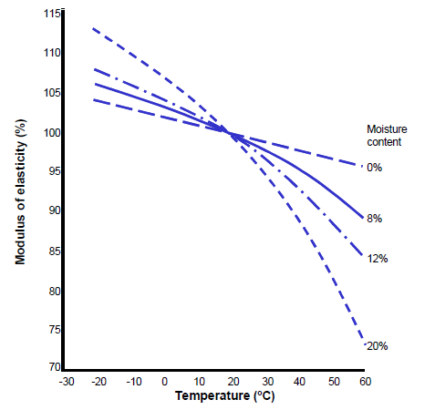 The interaction of temperature and moisture content on the modulus of elasticity.