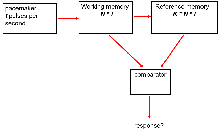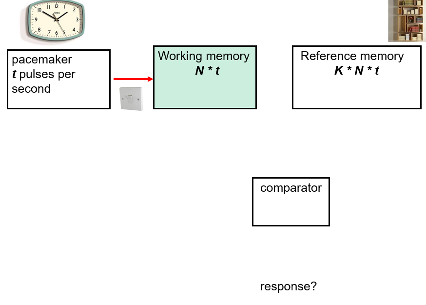 During the SCALAR TIMING THEORY, the storing of the duration of the stimulus (light) which predicts food deliverance is stored in which section?