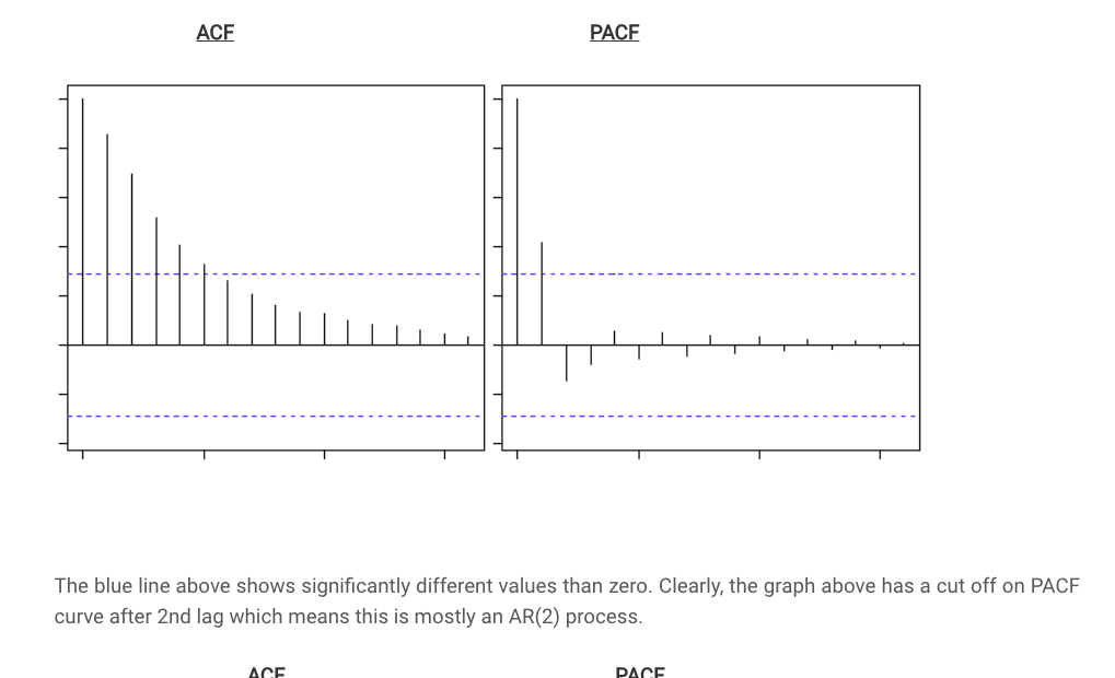 The blue line above shows significantly different values than zero. Clearly, the graph above has a cut off on PACF curve after 2nd lag which means this is mostly an AR(2) process