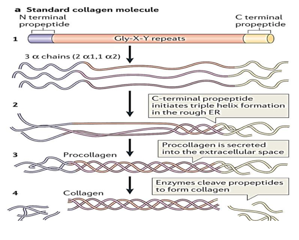 Rough ER: synthesis of preprocollagen; insertion of procollagen molecule into lumen of ER