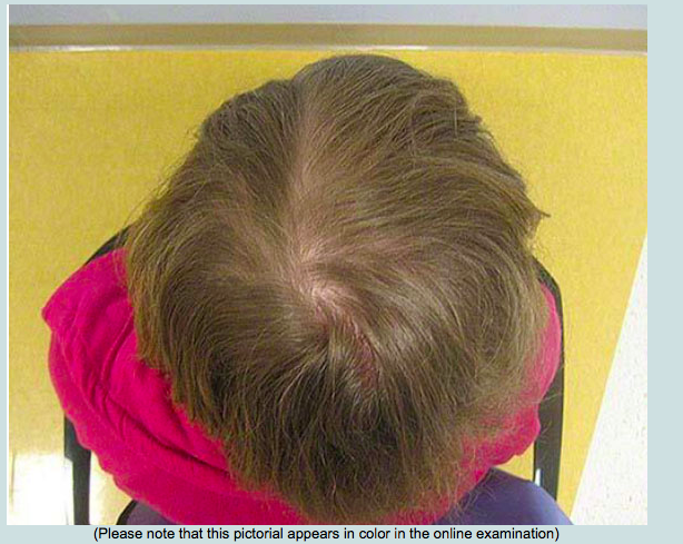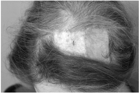 Hair transplantation is unlikely to be successful in this patient because of extensive scars in the area. Staged excision of the prior skin grafts and primary closure will not improve this patient’s alopecia and are unlikely to relieve the skin irritation caused by the thinned skin over the calvaria. Because advancement has already been done, little additional advancement can be achieved without back-grafting exposed areas. Full-thickness grafts will not allow sufficient hair growth or replacement.