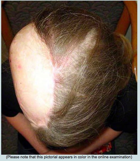 Tissue expansion effectively expands hair-bearing scalp that can then be rotated, advanced, and/or transposed over the area of alopecia to correct the deformity. A latissimus dorsi musculocutaneous free flap does not contain hair, and thus, would cause a similar area of alopecia. Follicular hair transplantation would not be efficacious for a large area of alopecia, and the split-thickness graft over periosteum would be insufficient tissue to accept the grafts. Serial excision of the skin graft is not possible because of the large defect and absence of normal scalp tissue on either side of the defect. A full-thickness graft from the hair-bearing scalp would cause a similar area of donor site alopecia.