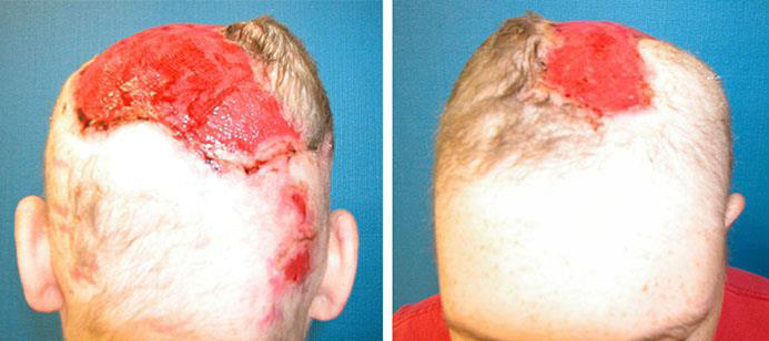 No other tissue or donor site in the body will approximate the hair-bearing qualities of scalp tissue. Simply, the best replacement for scalp tissue is scalp tissue. In addition to calvarial coverage and wound closure, the reconstructive surgeon should strive for a cosmetically pleasing outcome. In this patient with nearly 40% scalp loss, tissue expansion will provide the optimal functional and aesthetic outcome. Tissue expansion should be considered when local tissue rearrangements are inadequate because of defect size, trauma, or unacceptable rearrangement or distortion of the hairline. Tissue expansion increases the amount of locally available tissue, preserves sensation, and maintains hair follicles and adnexal structures.