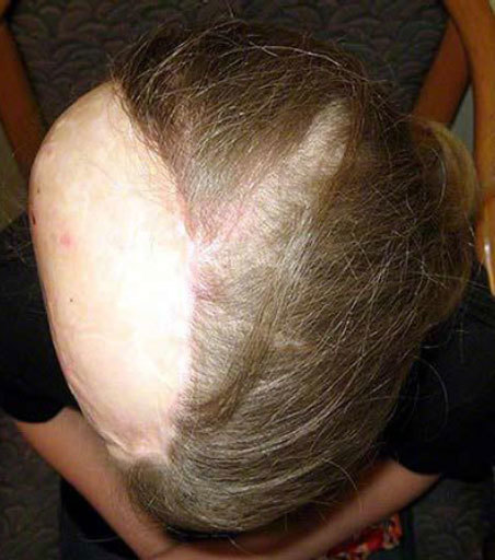 No other tissue or donor site in the body will approximate the hair-bearing qualities of scalp tissue. Simply, the best replacement for scalp tissue is scalp tissue. In addition to calvarial coverage and wound closure, the reconstructive surgeon should strive for a cosmetically pleasing outcome. In this patient with nearly 40% scalp loss, tissue expansion will provide the optimal functional and aesthetic outcome. Tissue expansion should be considered when local tissue rearrangements are inadequate because of defect size, trauma, or unacceptable rearrangement or distortion of the hairline. Tissue expansion increases the amount of locally available tissue, preserves sensation, and maintains hair follicles and adnexal structures.