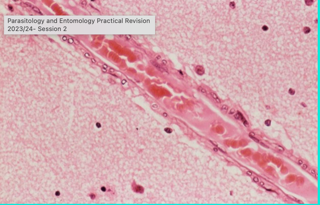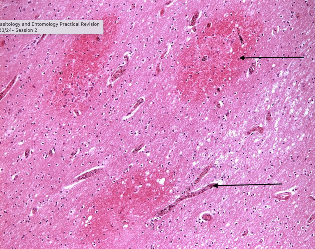 top arrow is ring haemorrhage and bottom arrow is the P.falciparum schizont.
