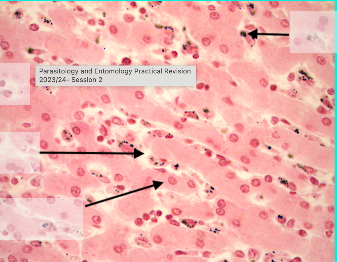 from Left top - arrows are : kuppfer cell, sinusoidal space, hepatocyte and one on right is haemazoin.