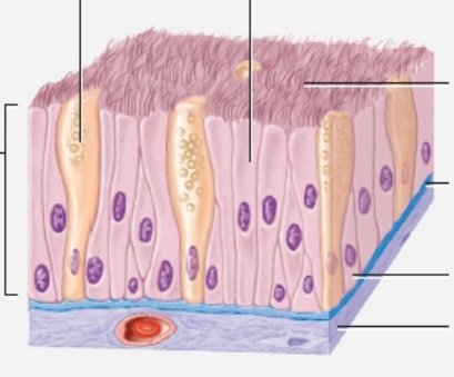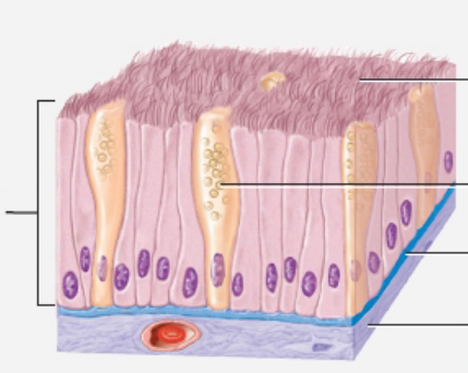 Function: secretes mucus to trap particles and cilia sweep away mucus for elimination