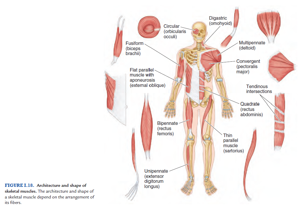 Fusiform muscles are spindle shaped with a round thick belly (bellies) and tapered ends. Biceps Brachii, psoas major, flexor carpi radialis, brachioradialis, extensor carpi radialis longus are a few examples.