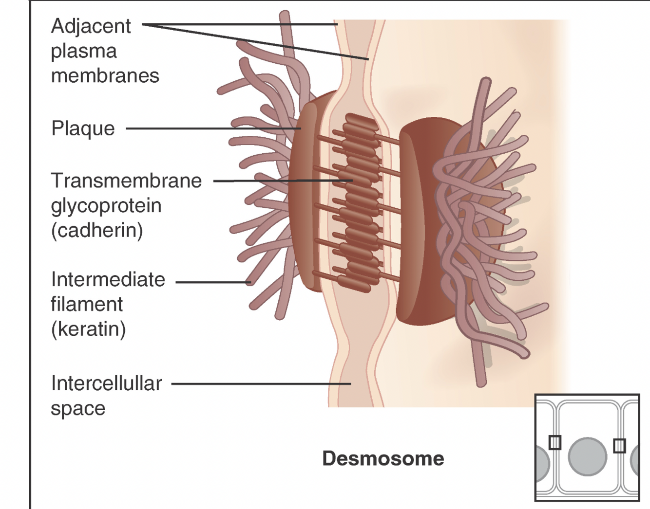 The adhesion molecule, cadherin, is embedded in these patches and projects through the cell membrane to link with the cadherin molecules of adjacent cells.