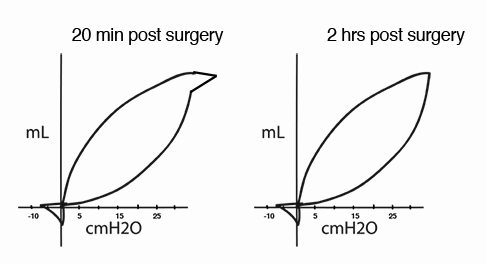 The initial graphic shows a small amount over-distension (indicated by the presence of a beak). Without any ventilator changes, the beak disappears, suggesting over-distension is no longer present. The most likely reason for this is that alveoli have been recruited with the institution of mechanical ventilation.