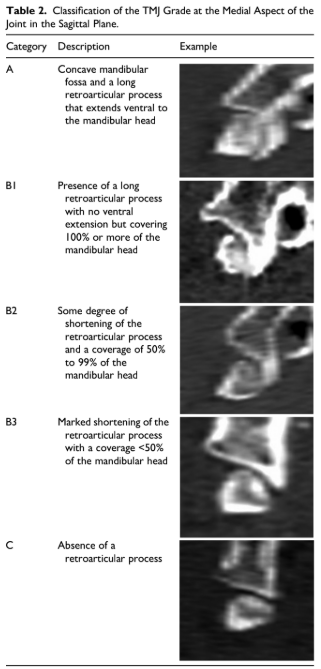 96.6% of TMJs had a well-defined, rounded articular head that fit deeply into the mandibular fossa.