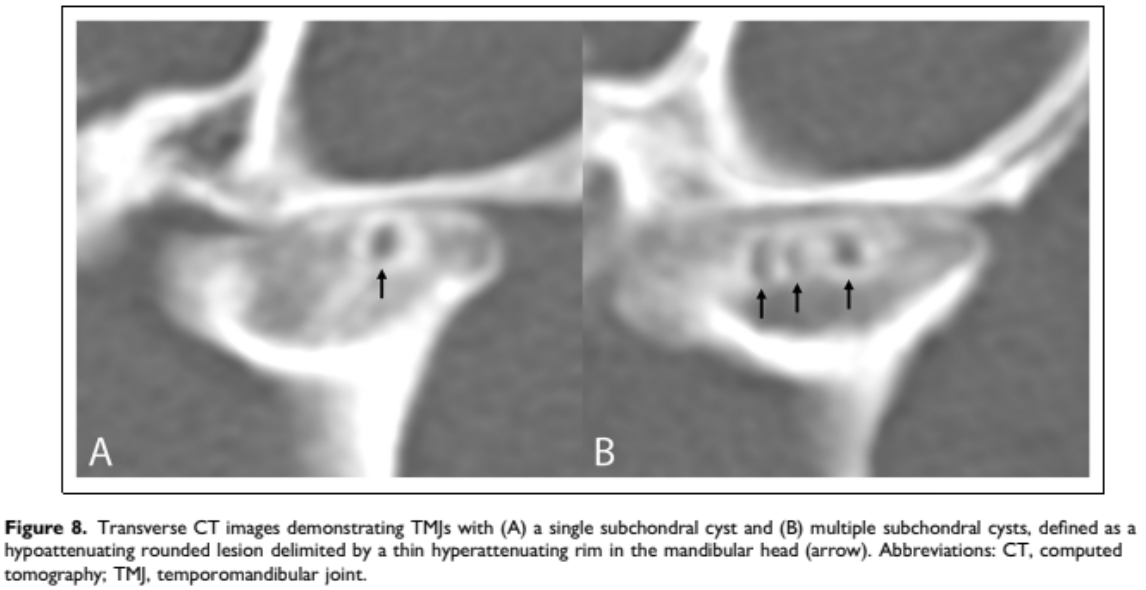 8 dogs had subchondral cysts in the mandibular head, but no signs of osteoarthritis were present. These were considered incidental findings.