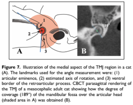 Cats have a higher degree of TMJ coverage (171°) than dogs, meaning their TMJ is more stable and tightly articulated.