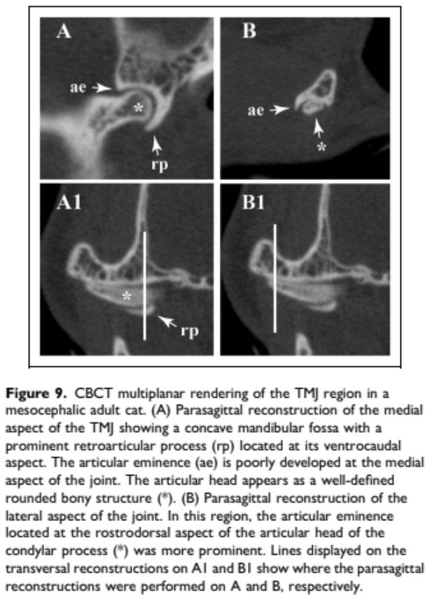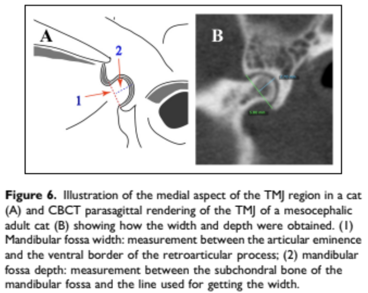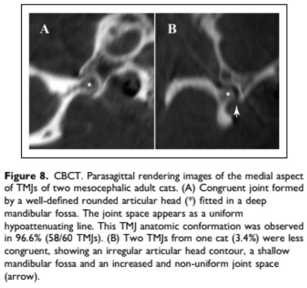 As a strict carnivore, TMJ congruence in the cat and the transversal disposition of the articular head into the mandibular fossa result in restricted movements of the mandibles in the sagittal plane, which allows cutting of food into small pieces before swallowing. The congruence of the TMJ may avoid dislocation of the condylar process from the mandibular fossa during the grasping of prey.