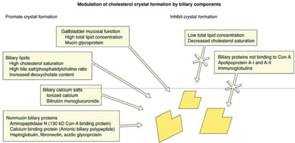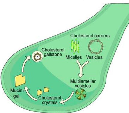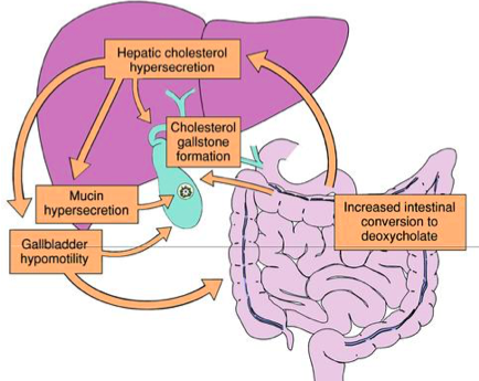 What 4 factors are implicated in the pathophys of cholesterol gallstone formation?