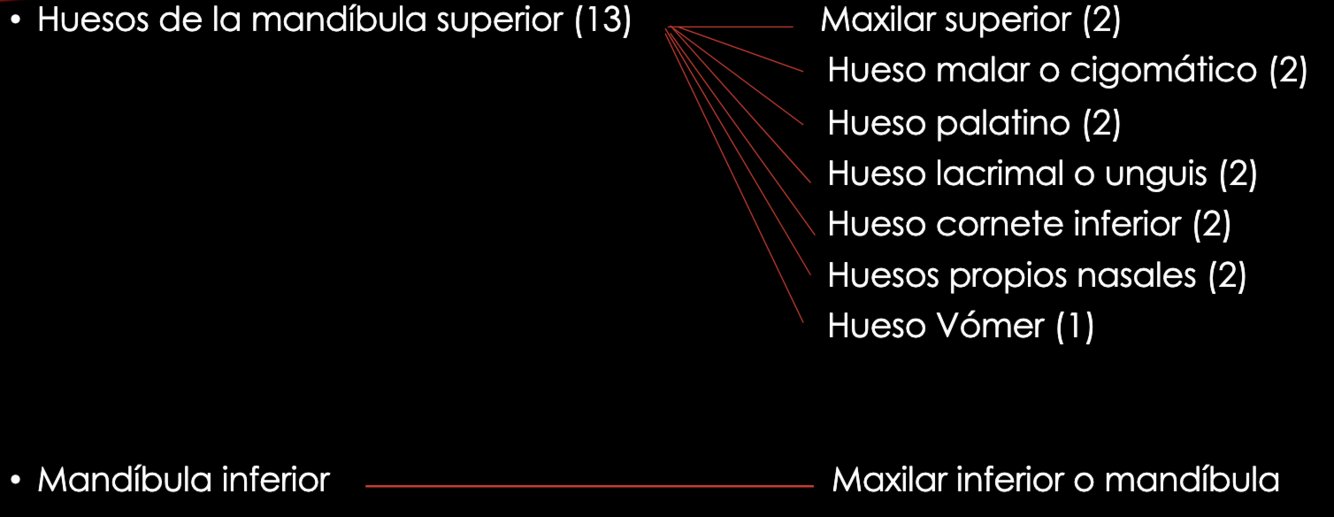 Maxilar superior, huesos propios nasales, frontal, etmoides, esfenoides, cigomático, vómer, palatino, mandíbula.