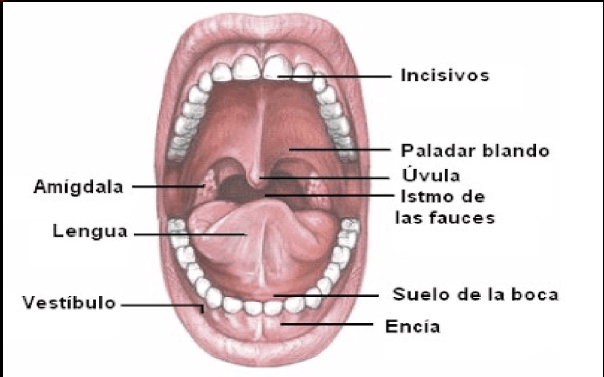 Labios, mucosa gingival, encías, piezas dentales, piso de boca, paladar, istmo de las fauces, glándulas salivales menores y desembocaduras de conductos (Wharton, Stenon)