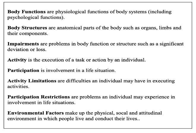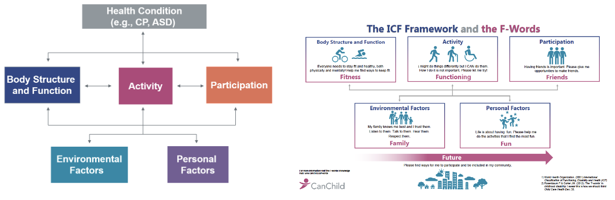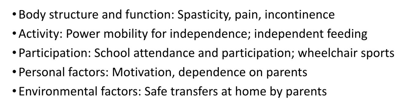 Name 1 goal under each ICF framework category for a child rehabilitation from spinal injury