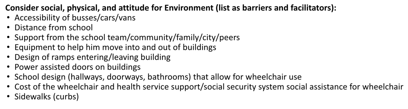 Name 3 environmental (ICF) factors that impact participation for a school age GMFCS III CP attending school