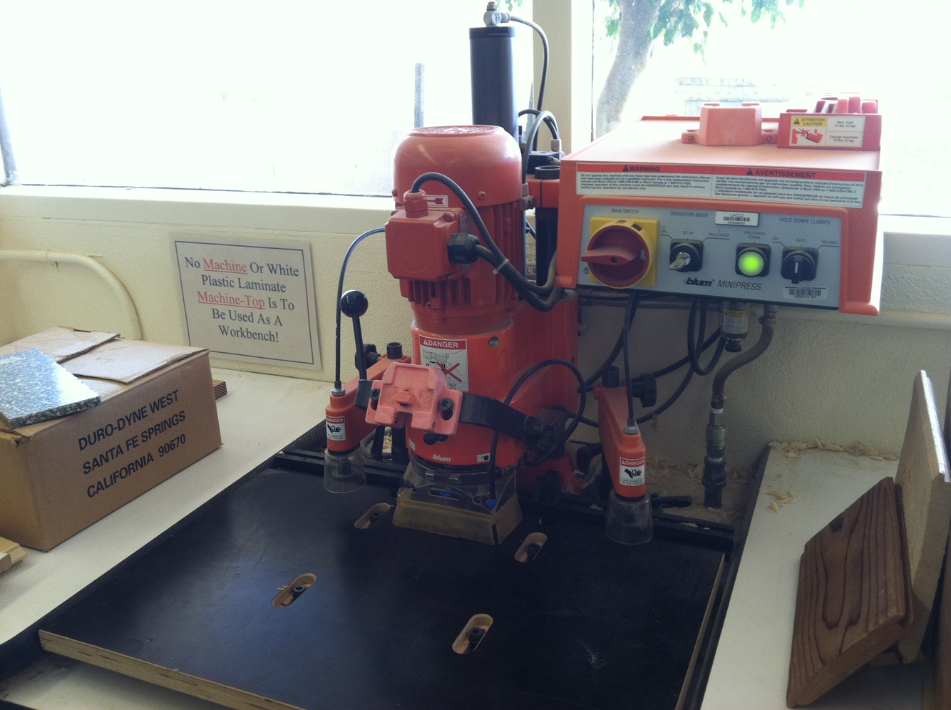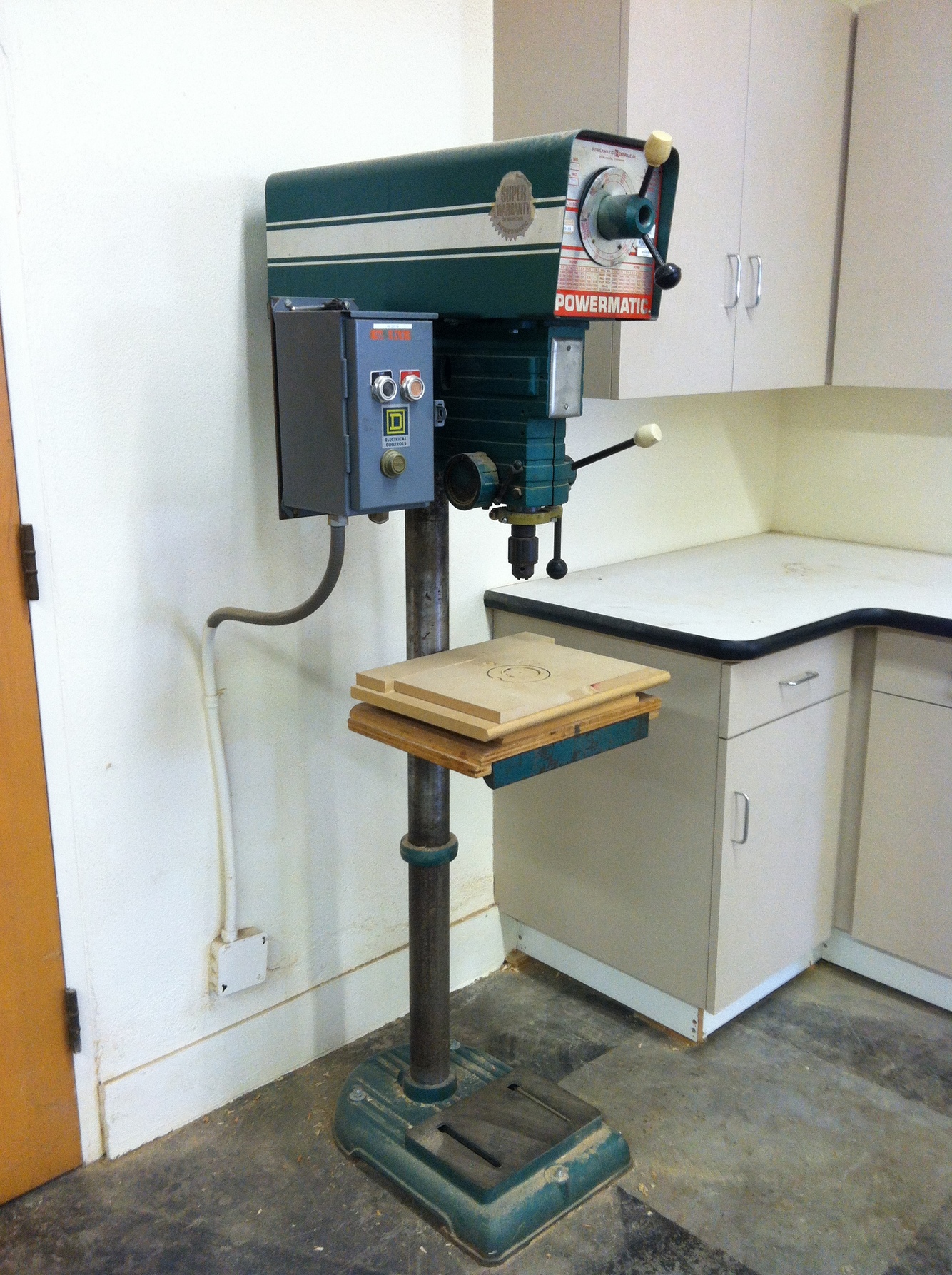 The stationary drill press is by far, the best tool in our lab facility for precision vertical drilling. Holes can be drilled ranging from 1/16” - 5” in diameter. Five inches is the largest hole-saw we have. What makes the drill press so valucable is as follows: it bores all holes at a precise 90 degre angle; it has an adjustable stop for duplicating fixed depths in multiple holes; its smooth pinion handle rotation easily allows for controlled feed speed when plunging; its adjustable spindle speed accomadates all drill-bit diameters; the adjustable table accepts most height sizes for stock; and an attached fence allows linear holes to be drilled precisely.