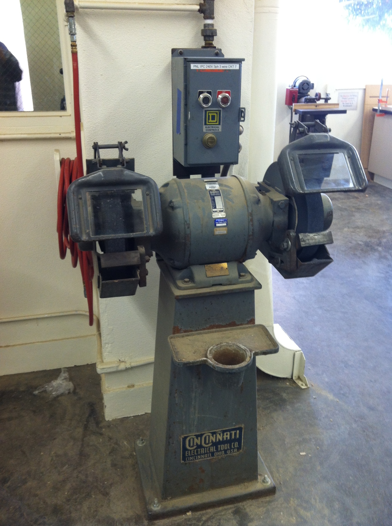 Whether it’s a bench grinder or a stationary grinder, woodworking lab facilities will always have at least one or the other in their arsenal of tools. It’s important to use sharp hand tools because they’re the safest to use. As mention earlier a dull tools requires more force to be applied. Therefore, a user’s chances for slipping are increased, making them more prone to injury. For this reason woodworkers learn to sharpen their own hand tools. The pedestal grinder (left) turns approximately 3450 rpm, necessitating safety shields to safeguard the operator’s eyes from sparks and metallic debris. The very slow turning Tormek bench grinder (shown right) only turns about 90 rpm and therefore doesn’t require safety shields.