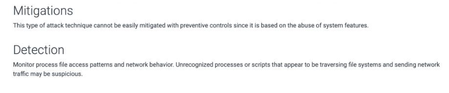Each TTP in the MITRE ATT&CK Framework also has mitigations and detection advice. If we look at this information for T1020, we’re provided with the following: