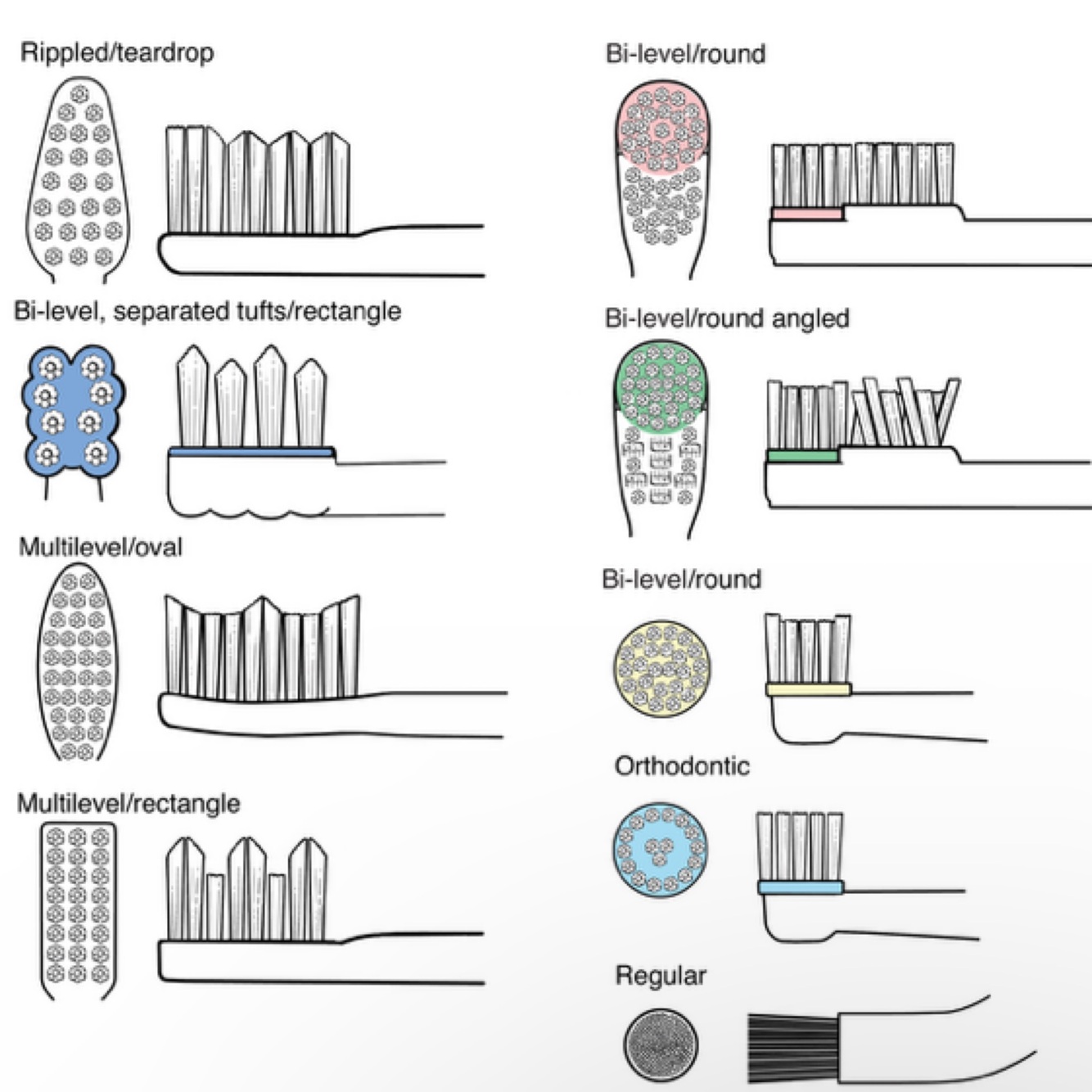Some research suggests ___designs of manual toothbrush heads and ____power brush heads are most effective.