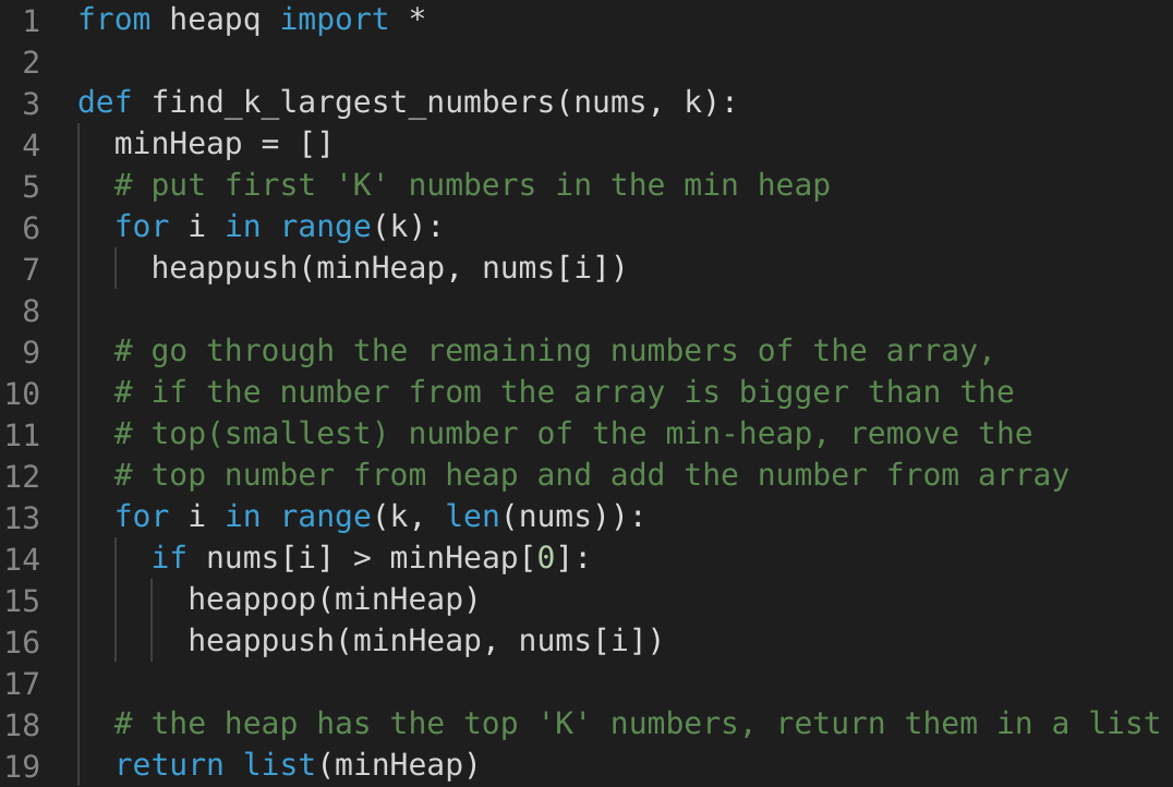 This will ensure that we always have ‘K’ largest numbers in the heap. The most efficient way to repeatedly find the smallest number among a set of numbers will be to use a min-heap. As we know, we can find the smallest number in a min-heap in constant time O(1), since the smallest number is always at the root of the heap. Extracting the smallest number from a min-heap will take O(logN) (if the heap has ‘N’ elements) as the heap needs to readjust after the removal of an element.