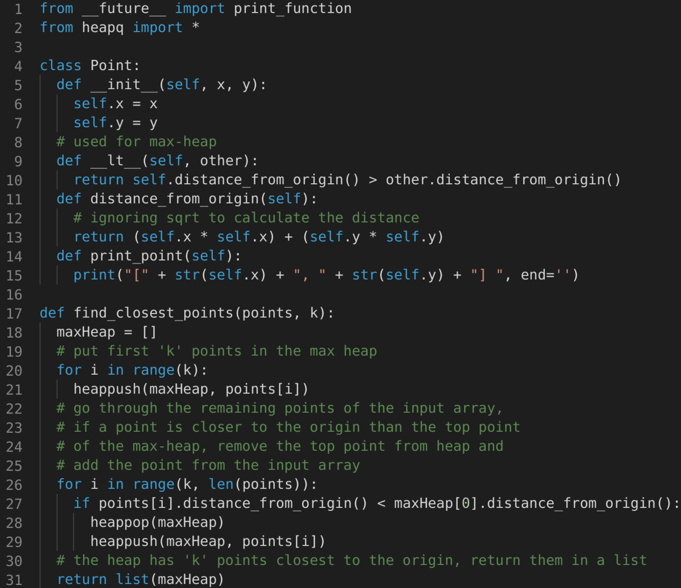 Following a similar approach, we can use a Max Heap to find ‘K’ points closest to the origin. While iterating through all points, if a point (say ‘P’) is closer to the origin than the top point of the max-heap, we will remove that top point from the heap and add ‘P’ to always keep the closest points in the heap.