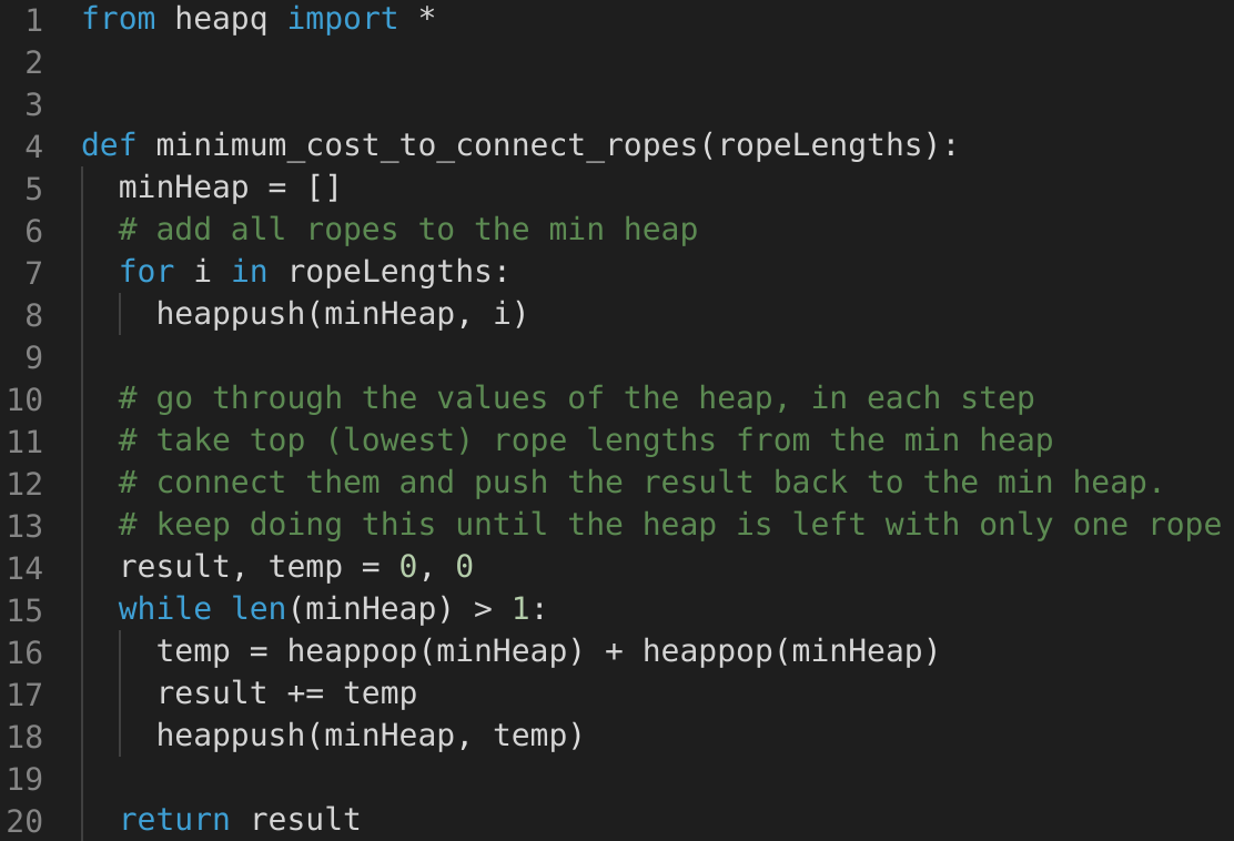 In this problem, following a greedy approach to connect the smallest ropes first will ensure the lowest cost. We can use a Min Heap to find the smallest ropes following a similar approach as discussed in Kth Smallest Number. Once we connect two ropes, we need to insert the resultant rope back in the Min Heap so that we can connect it with the remaining ropes.