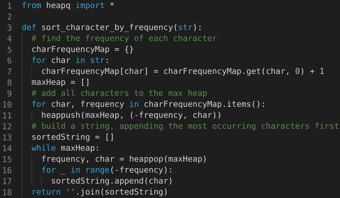 The time complexity of the above algorithm is O(D*logD) where ‘D’ is the number of distinct characters in the input string. This means, in the worst case, when all characters are unique the time complexity of the algorithm will be O(N*logN) where ‘N’ is the total number of characters in the string.
