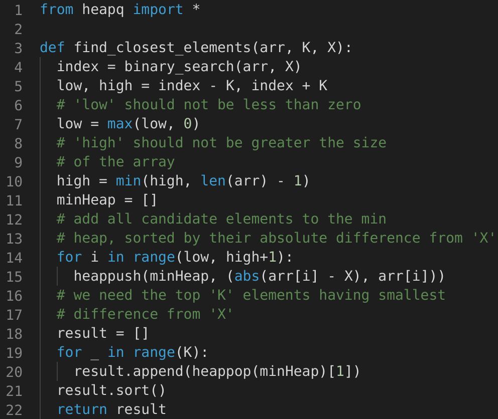 The time complexity of the above algorithm is O(logN + K). We need O(logN) for Binary Search and O(K) for finding the ‘K’ closest numbers using the two pointers.