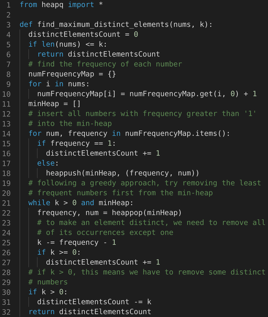 1. How can we keep track of the frequencies of numbers in the heap? When we are pushing a new number to the Max Heap, we don’t know how many times the number has already appeared in the Max Heap. To resolve this, we will maintain a HashMap to store the current frequency of each number. Thus whenever we push a new number in the heap, we will increment its frequency in the HashMap and when we pop, we will decrement its frequency.