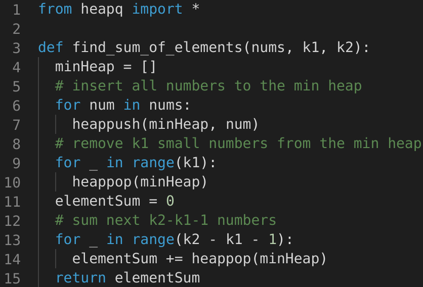 3. Now take the next K2-K1-1 numbers out of the heap and add them. This sum will be our required output.