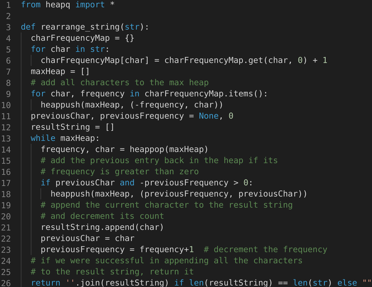 We can work in a stepwise fashion to create a string with all characters from the input string. Following a greedy approach, we should first append the most frequent characters to the output strings, for which we can use a Max Heap. By appending the most frequent character first, we have the best chance to find a string where no two same characters come next to each other.